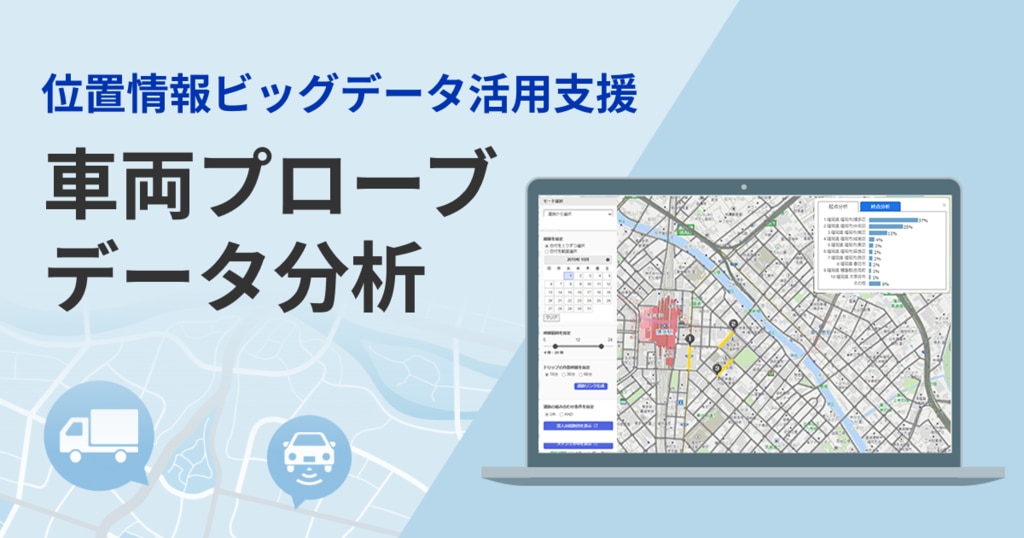 「車両プローブデータ分析」位置情報ビッグデータ活用支援車両プローブデータ分析SIer・コンサルティング人流や交通量を調べたいデータ提供レポーティング位置情報ビッグデータ活用支援商材ページSaaSコンサルティング2025-08-06 14:36