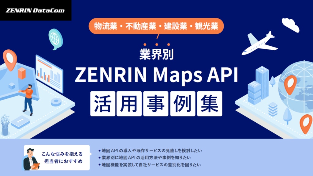 混雑統計®いつもNAVI APIZENRIN ロジスティクスサービスArea MarkerGoogle Maps Platform住所クレンジングサービス車両プローブデータ分析AreaCutterテレマティクスサービススマートファクトリーサービスジオフェンスライブラリZENRIN Maps APIドローンスナップソリューション全国避難所データベースGODOOR配達アプリゼンリン地図API × MATLAB®/Simulink®学術研究自動車危機管理・災害情報確認商社・小売・卸売製造建設電気・ガス・水道情報通信広告・メディア金融・保険SIer・コンサルティング不動産農・林・漁業飲食・サービス人材サービス教育・学習支援医療・福祉自治体・公務販売店検索機能観光サービスプラットフォームe-mobilog人員配置マップシステムで地図を利用したい地図システムの開発費抑制住所を正規化したい人流や交通量を調べたい観光のDX化を推進したい災害リスクに備えたい設備点検を効率化したい印刷物で地図を使いたいEV・PHEV運用管理効率化人員配置業務を効率化したいデータ提供レポーティング位置情報ビッグデータ活用支援インバウンド分析保有データ分析2000名以上1-100名101名-2000名商材ページ顧客や物件情報管理の効率化MEO・エリアマーケティング対策カスタマーサポートの効率化APISDKSaaSシステム開発コンサルティング地図システム開発