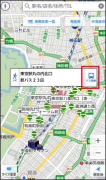 地図の中心地点の最寄りバス停と周辺バス停が表示されます。