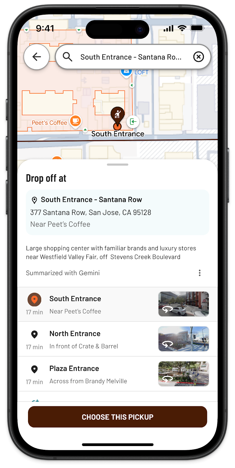 ナビゲーションポイントとストリートビューにより、ライドシェア利用者は最適な降車場所を確認・選択できます